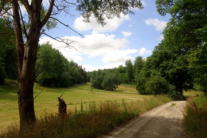 Lippbachtal, Höhe „Im Kaltenborn“ (zu Wiesbaden-Dotzheim); der Weg rechts ist Teilstück des Rundwegs „Hase“ und der Wanderroute „schwarzer Punkt“